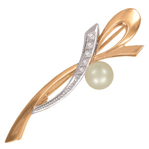 Брошь из комбинированного золота 585 пробы с 5 цирконами и 1 белой жемчужиной.