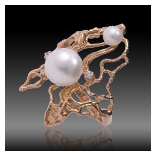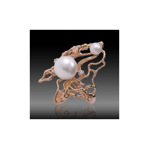Кольцо из красного золота 585 пробы с 2 белыми жемчужинами и 3 фианитами
