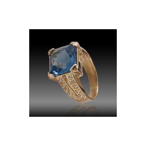 Кольцо из красного золота 585 пробы с 1 голубым топазом и 24 фианитами