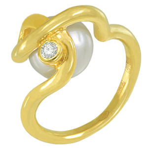 Кольцо необычной формы из желтого золота 585 пробы с белой жемчужиной и бриллиантом.