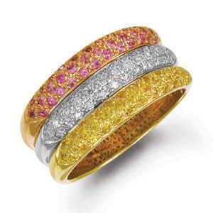 Кольцо из комбинированного золота 585 пробы с 27 бриллиантами и 74 цветными сапфирами.
