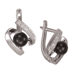 Серьги из белого золота 585 пробы с 12 бриллиантами и 2 черными жемчужинами