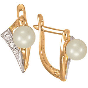 Серьги из комбинированного золота 585 пробы с 2 жемчужинами и 6 цирконами