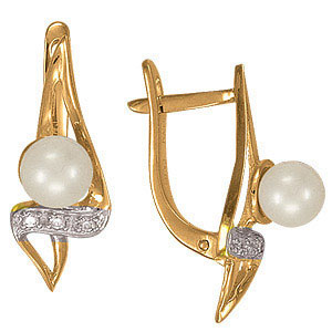 Серьги из красного золота 585 пробы с 2 жемчужинами и 6 цирконами