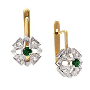 Серьги из комбинированного золота 585 пробы с 8 бриллиантами и 2 изумрудами