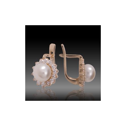 Серьги из красного золота 585 пробы с 2 белыми жемчужинами и 28 фианитами