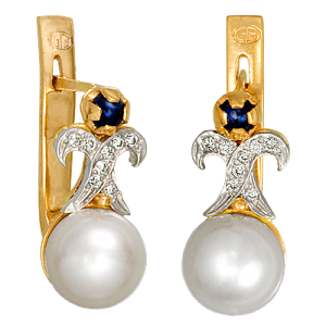 Прекрасные серьги из красного золота 585 пробы с 16 бриллиантами 2 сапфирами и 2 белыми жемчужинами. Изумительный подарок любой женщине.