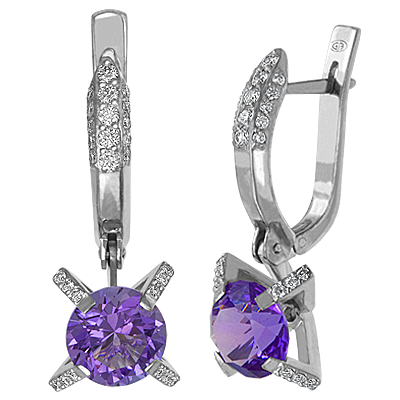 Очаровательные серьги из белого золота 585 пробы с 54 бриллиантами и 2 аметистами. Прекрасный подарок любой женщине.