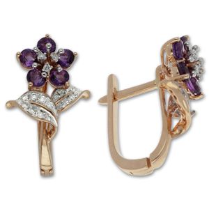 Серьги из красного золота 585 пробы с 42 бриллиантами и 10 аметистами