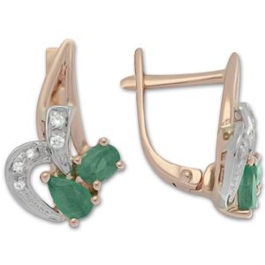 Серьги из комбинированного золота 585 пробы с 10 бриллиантами и 4 изумрудами