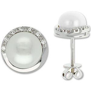 Пусеты из белого золота 585 пробы с 14 бриллиантами и 2 белыми жемчужинами