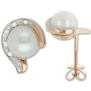 Пусеты из красного золота 585 пробы с 10 бриллиантами и 2 белыми жемчужинами